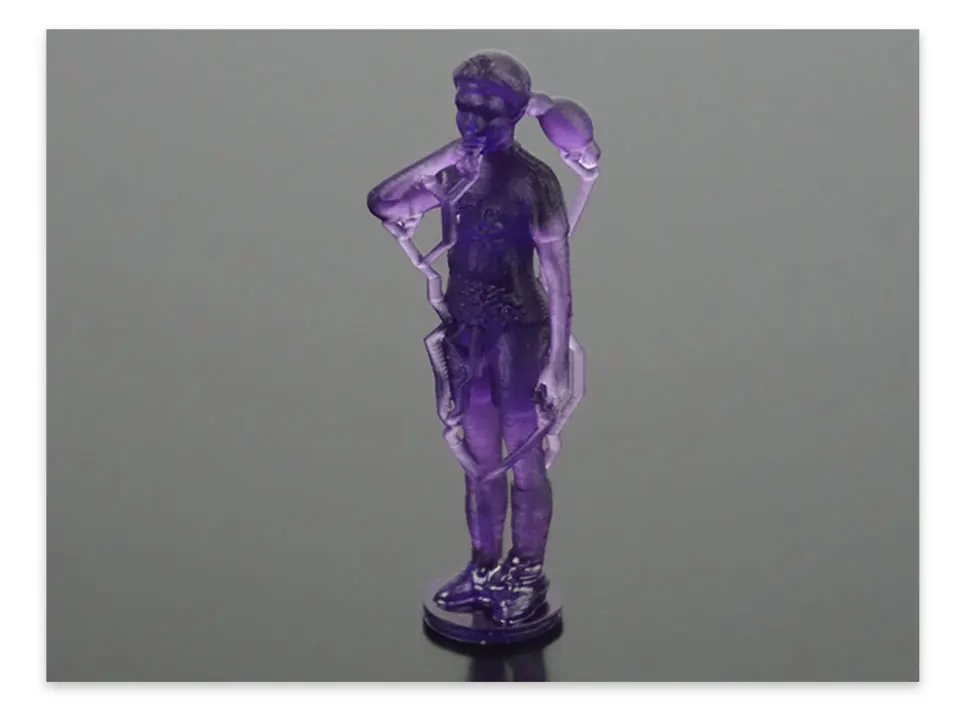 Гладкие поверхности имеют ровный вид, и практически отсутствуют линии слоев благодаря высоте слоя 0,05 мм и разрешению X/Y 0,04 мм. Выступы, оставленные опорной конструкцией, легко отделяются, и их можно удалить, просто проведя по ним пинцетом.