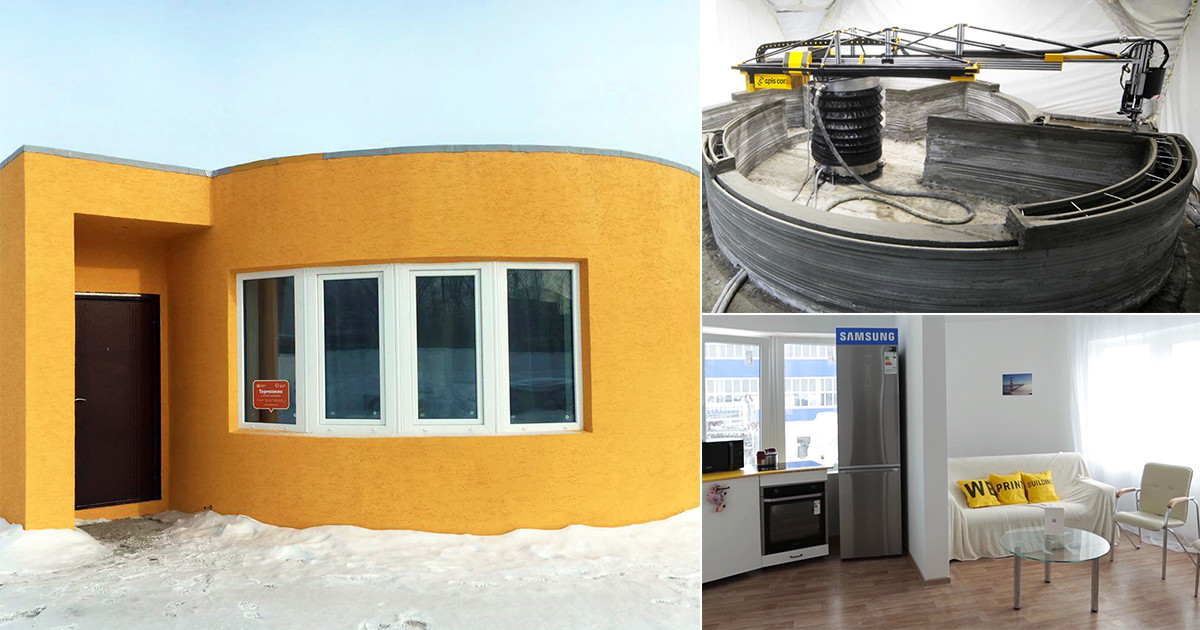 В 2014 году китайская компания WinSun первой построила несколько домов, используя технологию 3D-печати для производства элементов за пределами площадки. В 2017 году ApisCor первой в России напечатала целый дом на 3D-принтере. В 2019 году, 3D Printhuset изготовила первый в Европе 3D-печатный дом в Копенгагене (BOD) с использованием бетона и 3D-принтера с роботизированной рукой (3dprinthuset.dk).