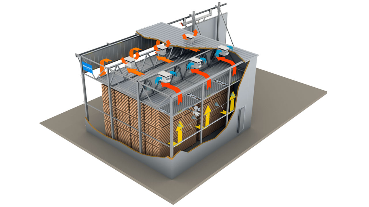 При необходимости можно менять параметры циркулирующего воздуха – увлажнять его или заменить на сухой. По камере воздух циркулирует посредством вентиляторов. Для эффективной сушки в конвективных сушильных камерах используется не менее 3-х вентиляторов. Это обеспечивает равномерную сушку древесины и ускоряет процесс сушки пиломатериалов. Схема работы конвективной сушильной камеры В зависимости от функционального назначения древесины конвективные сушильные камеры позволяют выбирать конечную влажность сушки. Например: