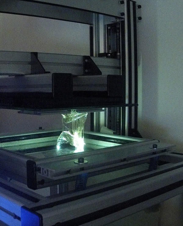 ΠΠ½ΡΡΡΠ΅Π½Π½ΡΡ Π΅ΠΌΠΊΠΎΡΡΡ ΠΏΡΠΈΠ½ΡΠ΅ΡΠ° Π·Π°ΠΏΠΎΠ»Π½ΡΠ΅ΡΡΡ ΠΆΠΈΠ΄ΠΊΠΈΠΌ ΡΡΡΡΠ΅ΠΌ, Π΄Π°Π»Π΅Π΅, ΡΠ»Π΅Π΄ΡΡ ΡΠΈΡΡΠΎΠ²ΠΎΠΉ ΠΌΠΎΠ΄Π΅Π»ΠΈ Π² STL-ΡΠΎΡΠΌΠ°ΡΠ΅, Π»ΡΡ Π»Π°Π·Π΅ΡΠ° Π²ΡΡΠΈΡΠΎΠ²ΡΠ²Π°Π΅Ρ ΠΈΠ·Π΄Π΅Π»ΠΈΠ΅, ΠΏΡΠΈΠ΄Π°Π²Π°Ρ ΡΠ²Π΅ΡΠ΄ΠΎΡΡΡ Π½Π΅ΠΎΠ±Ρ